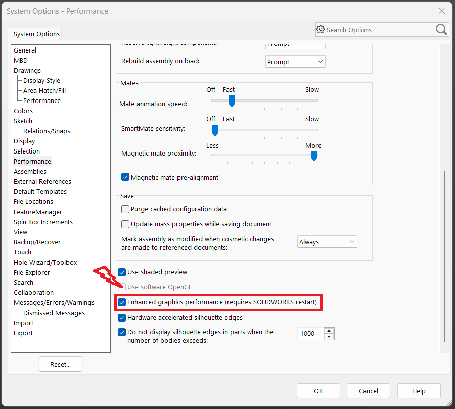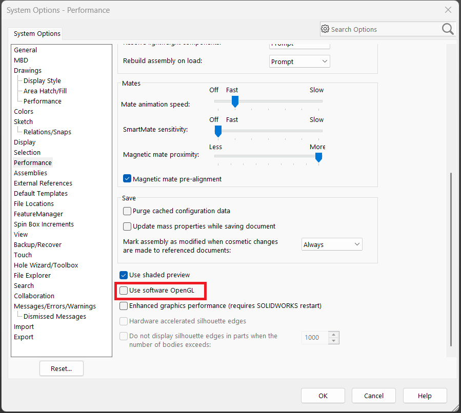 Second, starting with SOLIDWORKS 2019, the Enhanced Graphics Performance option may be enabled. When this option is checked, Software OpenGL cannot be activated. This setting is located under Tools > Options > Performance, on the same page as the Software OpenGL option.