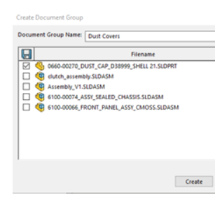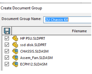 There are some rules for creating document groups. To be added to a Document Group, the file needs to be opened in SOLIDWORKS. If the file has been edited, it needs to be saved before it can be added to the document group.